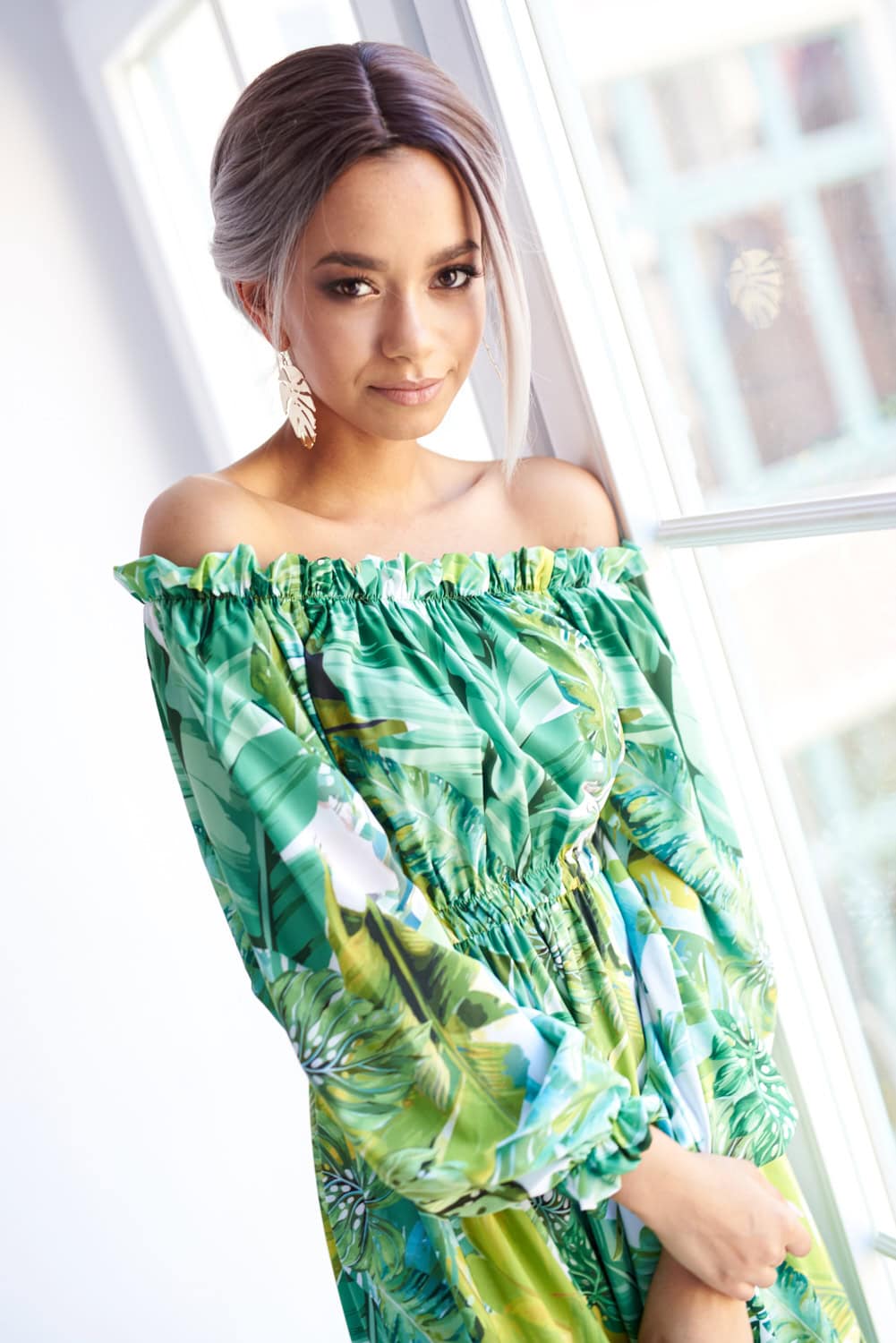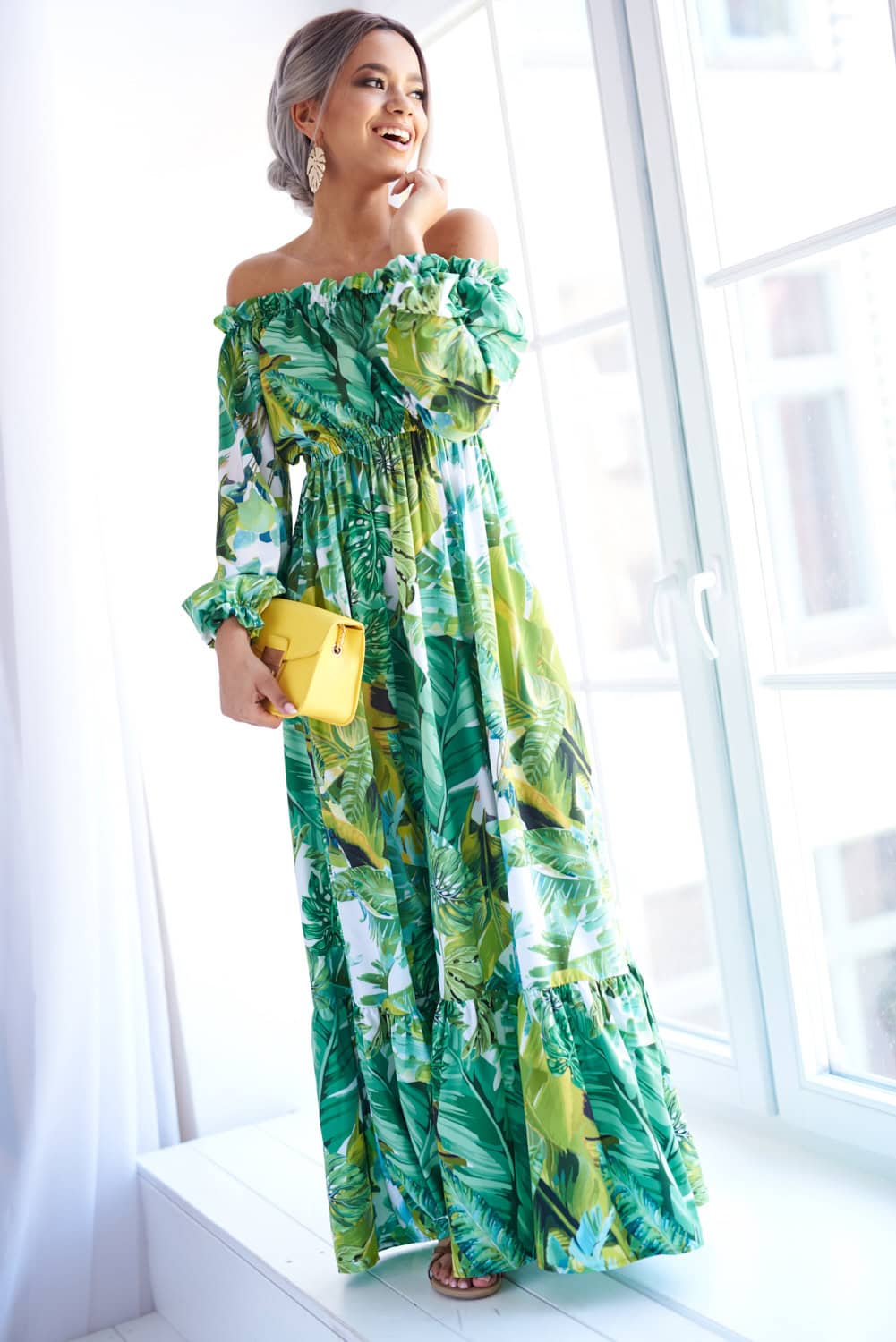 Bananowa kreacja o pięknym kolorze. Nasycona cudownymi barwami wiosny, nadaje barw codzienności. Ta MAXI to absolutny majstersztyk! Piękny nadruk, kolory i niesamowity krój właśnie odrobinę w stylu BOHO! Sukienka osiada delikatnie bufiaste rękawy wykończone drobną falbanką, do tego piękna falbana na dole sukni. Wszystko tworzy niesamowity efekt, który będzie pasował każdej z nas! Czy przekona Was jeszcze to, ze sukienka cudownie odsłania ramiona? Ideał na lato i letnie spacery brzegiem morza.