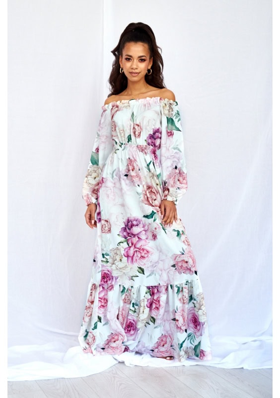 Alexa również zdecydowała się na sukienkę maksi, ale tym razem w delikatne kwiatki i oczywiście pastelowych kolorach. Ta sukienka to świetny wybór również na wszelkiego rodzaju imprezy okolicznościowe, a przecież strong>sezon komunii i ślubów trwa, więc nie ma co się zastanawiać 🙂