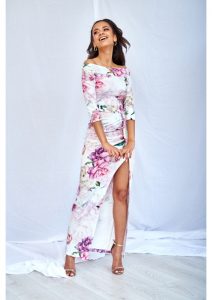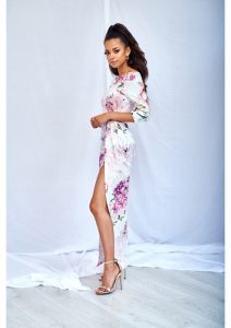 I na koniec zostawiłam Wam smaczek! Sukienka maksi z seksownie odkrytymi ramionami, piękny pastelowy kolor i ten kwiatowy wzór. Do tego rozporek, który super wyeksponuje nogi i doda całości nutki ekstrawagancji, ale to wszystko ze smakiem. W takiej sukience będziesz czuła się bardzo kobieco 🙂
