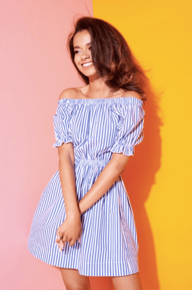 Z jednej strony paski pionowe– idealne rzecz by można bu wyszczuplają, do tego zaznaczona talia- tutaj można tez poszaleć z paskami jeśli lubicie(ja kocham takie kontrasty). Do tego seksownie zaznaczone ramiona i te kolory MUST HAVE tego lata i tej wiosny.