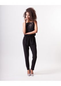 Klasyczny i ponadczasowy kombinezon z absolutnie fenomenalnym dekoltem i koronkowym wykończeniem. Idealnie sprawdzi się zarówno na małe jak i duże wyjścia. Ze spokojem można go ubrać do szpilek jak i kozaków.