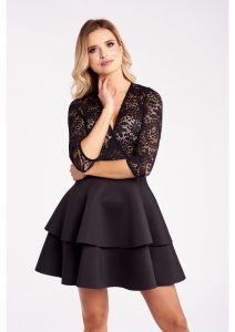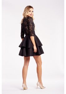 Generalnie sukienki z rozkloszowanym dołem są świetnym wyborem. Jeśli potrzebujesz coś zamaskować albo odwrócić uwagę od bioder to taki krój będzie idealny. Do tego piękna, romantyczna koronka i wycięcie na plecach. Całość wygląda cudownie. Dla osób, które nie chcą odkrywać pleców polecam wersję nieco bardziej zabudowaną, bardziej dziewczęcą i mniej odważną, ale równie elegancką i imprezową 🙂