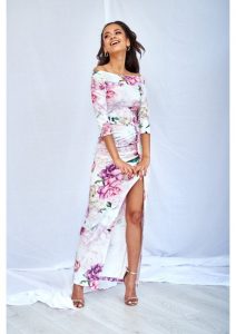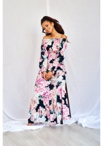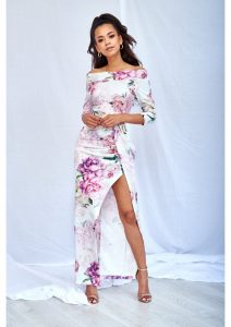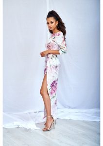 A co powiecie na dopasowaną i seksowną wersję kwiatów. Odkryte ramiona, długie rozcięcie z boku, które eksponuje piękne nogi i cudowne kwiaty. To świetny wybór na wesele, komunię czy bankiet.