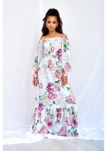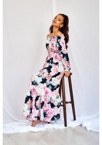 Jeśli wolisz jasne kolory to ta propozycja przypadnie Ci do gustu. Piękne kwiaty, zwiewny materiał, odkryte ramiona, falbana na dole, która pięknie powiewa w ruchu i cudowne kolory. W takiej sukience będziesz czuła się jak księżniczka.